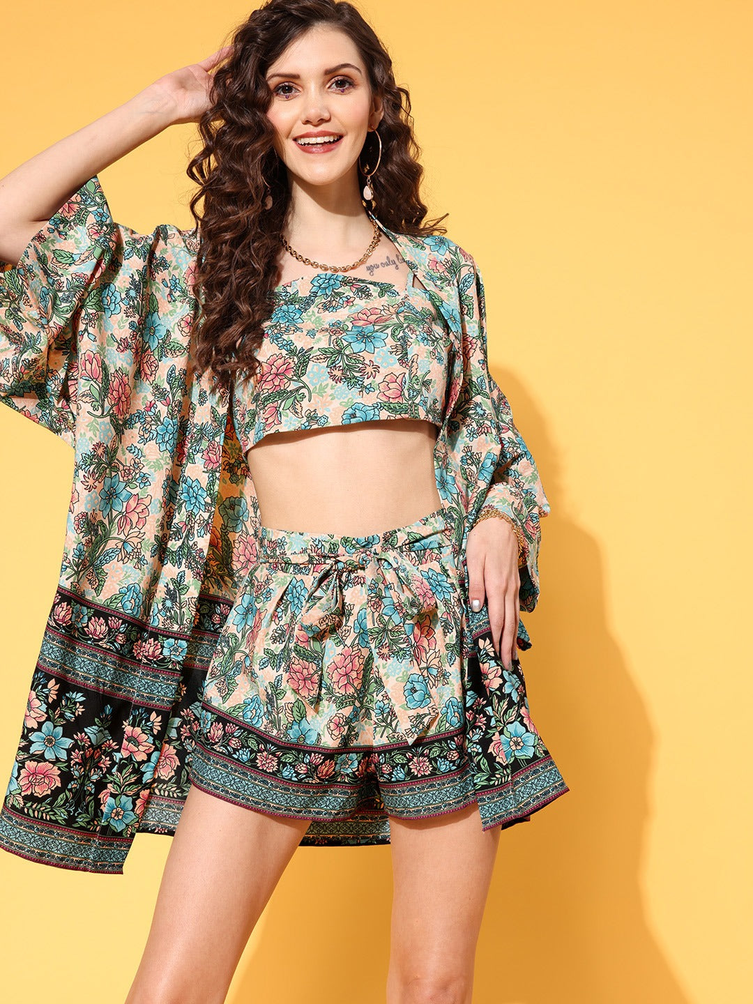 Floral Printed Crop Top & Tie-Up Front Shorts With Kimono